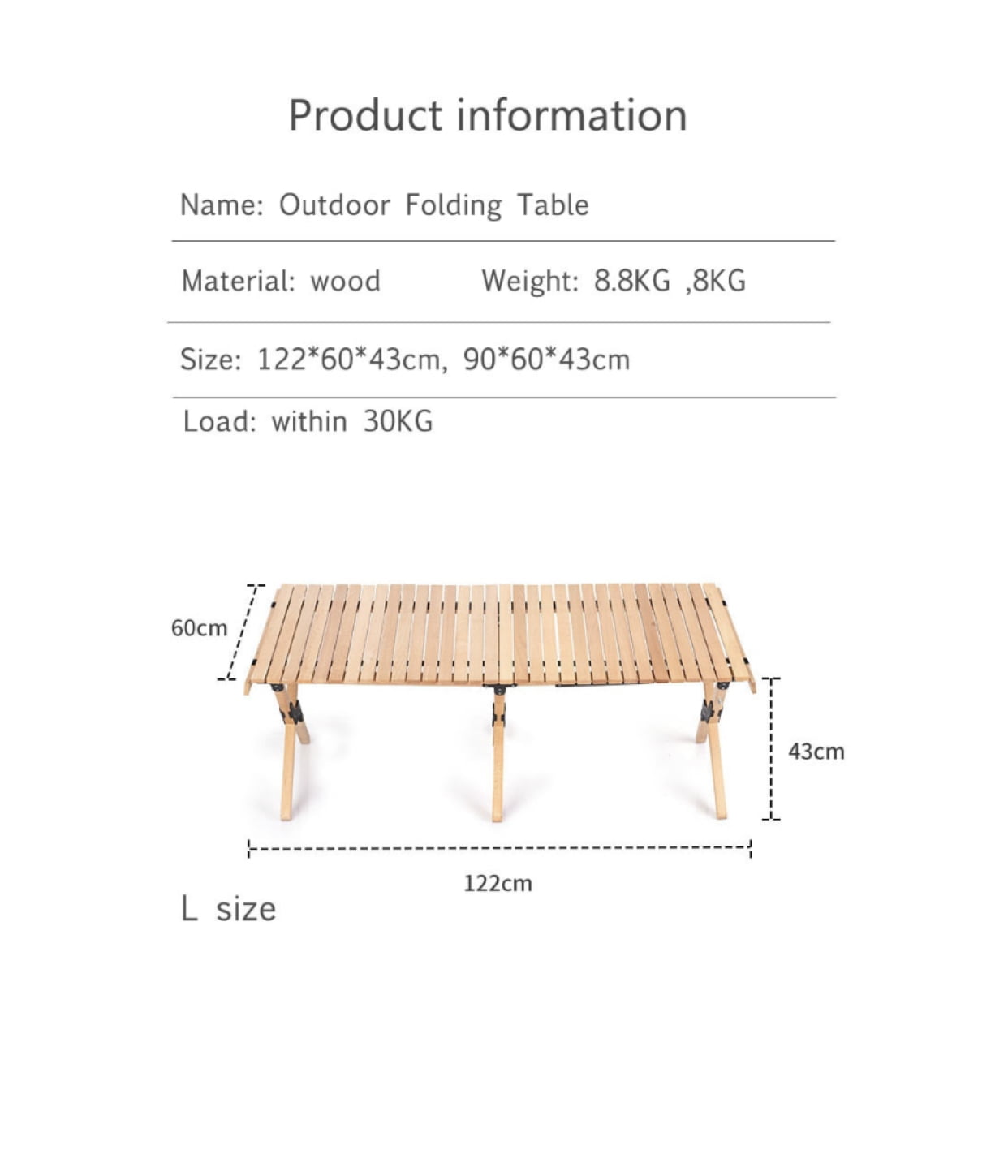 This wooden foldable outdoor wooden table comes with a bag, which is easy to carry and suitable for outings and outdoor use. The Folding Camping Picnic Table comes with a handy Carry Bag and is easy to transport and assemble. This table can handle a load of up to 30kg and is perfect for your picnic snacks and drinks.